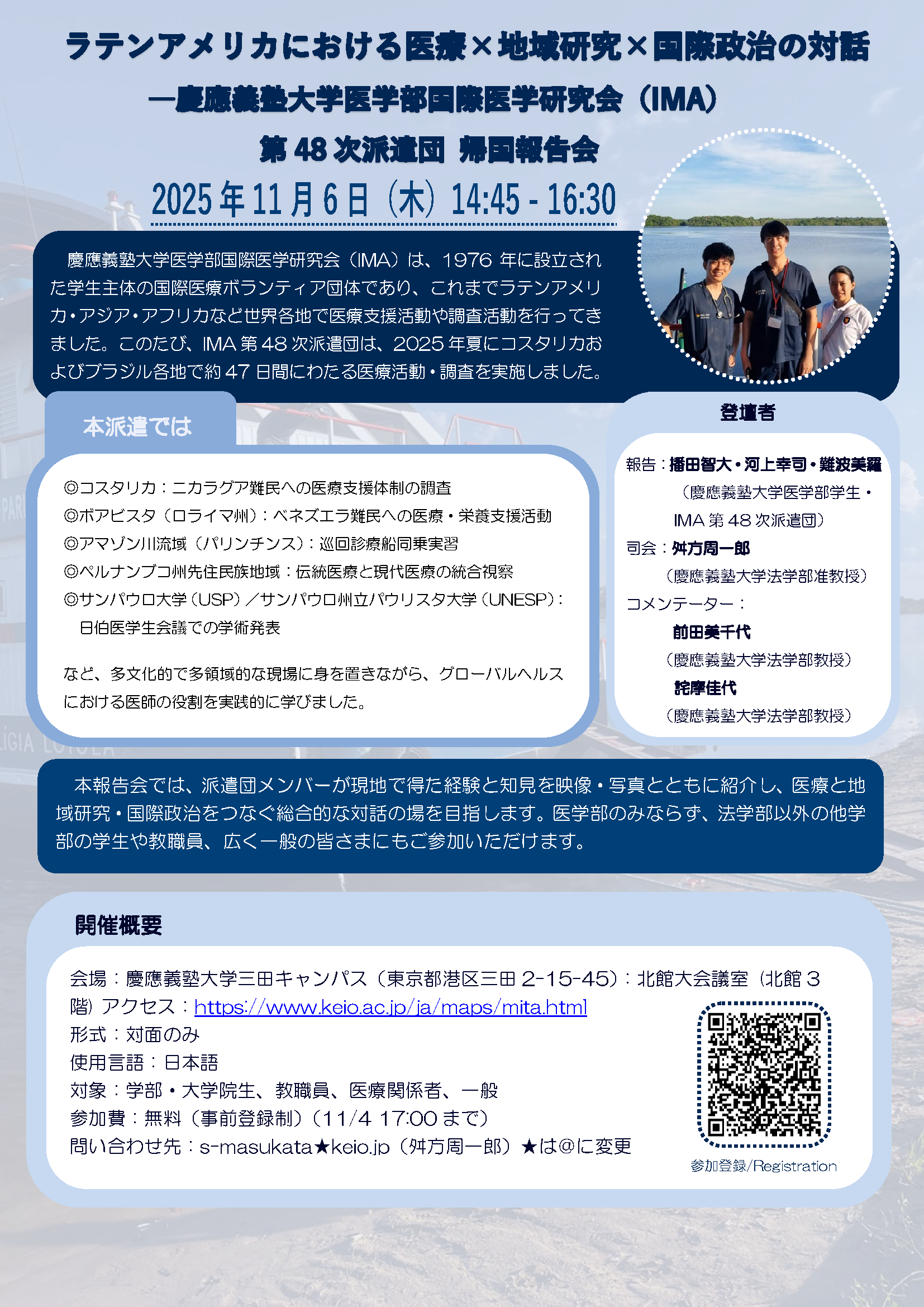 ── 慶應義塾国際医学研究会(IMA)第48次派遣・医療活動調査報告会」が開催されます。