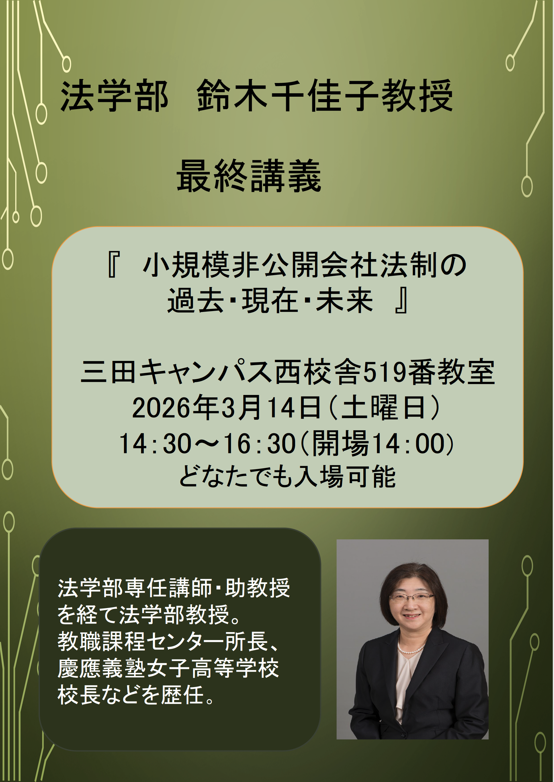 今年度末をもって定年退職をされる法学部・鈴木千佳子教授の最終講義が以下の要領にて開催されますので、お知らせします。